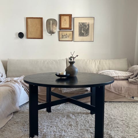 Runt, svart soffbord IKEA Vejmon. Två plan, hylla under. Lite märkt av tidens tand men helt OK.