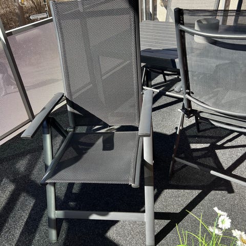 Trädgårdsstol med hög rygg och sittdyna i ljus färg. Stolen har armstöd och ställbar rygg, lämplig för uteplats, altan eller trädgård. Metallstomme i grå ton med vadderad dyna för ökad sittkomfort. Passar som del av utegrupp tillsammans med bord och andra stolar.