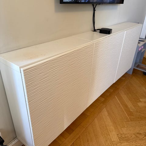 Säljer en fin TV-bänk/sidobord i vitt med elegant mönster på luckorna som ger ett exklusivt intryck.