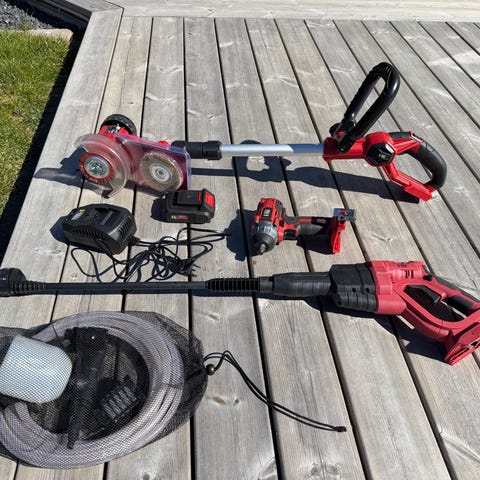 Motorsåg med teleskopskaft i röd färg. Sågen är eldriven och sitter monterad på ett förlängningsskaft som underlättar kapning på högre höjd, till exempel grenar och mindre träd. Utrustningen består av själva motorsågen samt teleskopskaft med handtag. Lämplig för trädgårdsarbete och beskärning där räckvidd behövs.