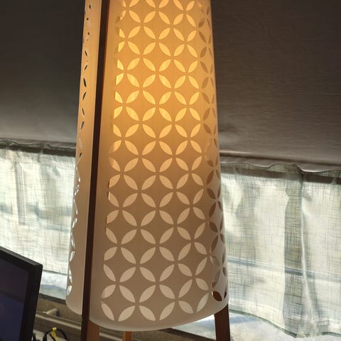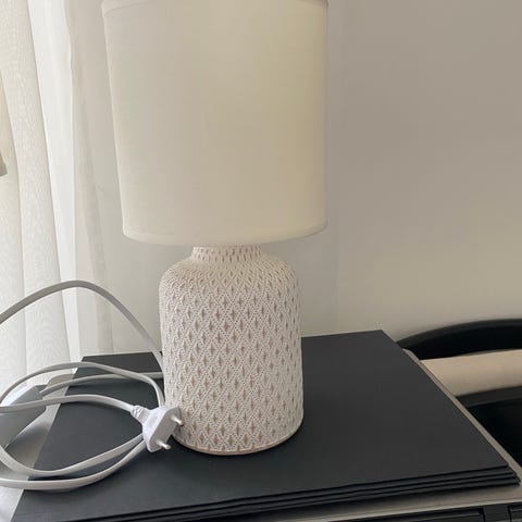 Snygg bordslampa från IKEA med dekorativ skärm i vitt och guld som ger ett varmt och mysigt ljus. Passar perfekt i sovrum, vardagsrum eller som stämningsbelysning.
