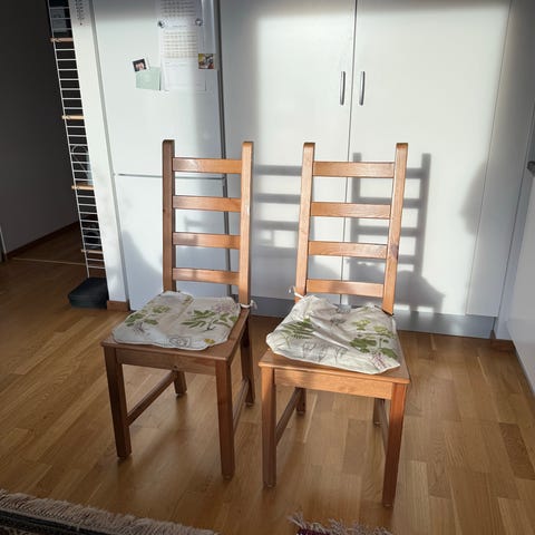 Hämtas så fort som möjligt. De har använts i flera år, och är därför slitna och smutiga. Fåtöljen, matborden och stolarna går återanvändas samt att tvättas rent. Byrån är något sönder. Men allt ska bort på en och samma gång.