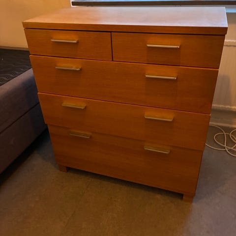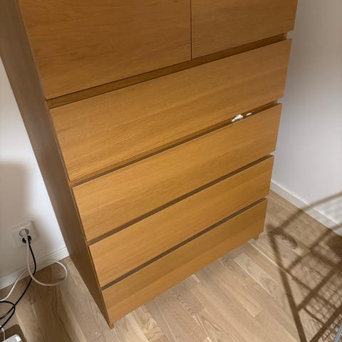 I trä utseende med sex lådor, två småa (H-16cm, B-32cm, D-43cm) och fyra stora (H-16cm, B-72cm, D-43cm).