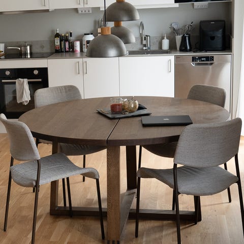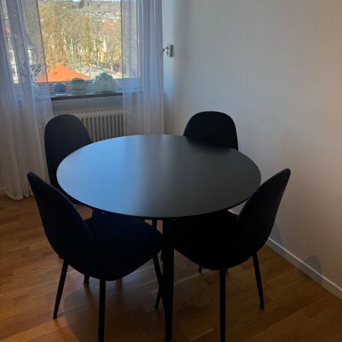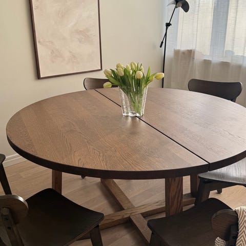 Matbord Ikea Mörbylånga ek/brunlaserat, runt 145 cm diameter, 76 cm högt. inköpt december 2024 i mkt bra skick. Nypris 7495 kr. Fyra stolar Ikea Mossberg ingår, nypris 1195 kr /st. Allt säljes pga flytt. I mitt pris ingår stolarna utan extra kostnad.