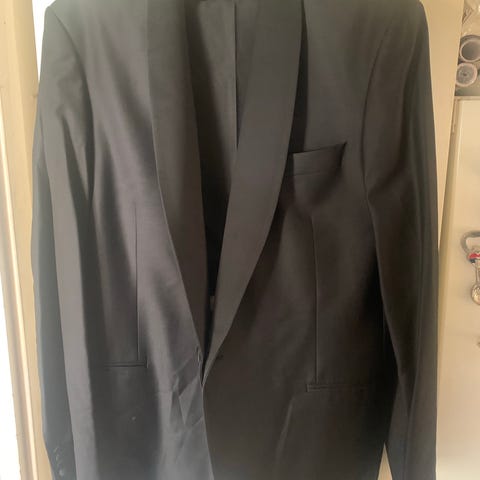 Denna smoking har använts en gång och är i mycket fint skick. Fluga kan bifogas. Jackan i C52. Den är mörkare än på bilden, som togs i solljus. 55% Polyester 45% Wool