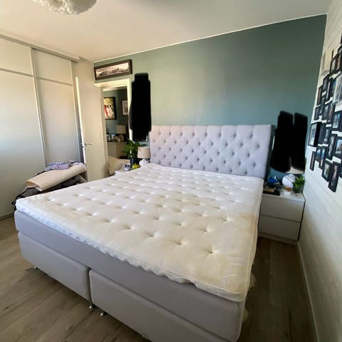 Kontinentalsäng med vadderad bäddmadrass och stoppad sängram. Ljus klädsel i textil. Passar som dubbelsäng i sovrum. Sängen står på ben som ger utrymme under för städning eller förvaring.