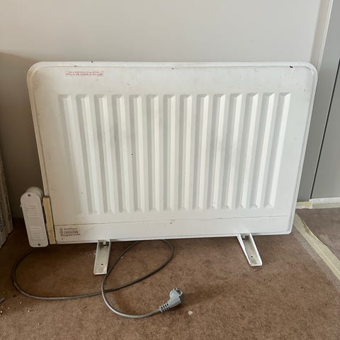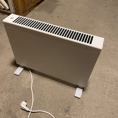 Element i vit färg för uppvärmning av inomhusmiljö. Elementet är fristående med ben och ansluts med stickpropp till vägguttag. Utrustad med ventilationsgaller framtill för spridning av värme. Passar för användning som extra värmekälla i exempelvis rum, garage eller förråd. Mått framgår delvis av bilder med måttband för höjd och längd.
