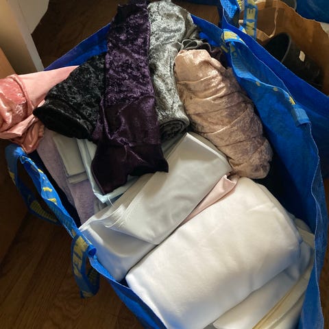 Blandad samling tyger och klädesplagg i olika färger, mönster och material. Bilderna visar både enfärgade och mönstrade textilier samt några färdiga plagg. Lämpligt för sömnad, hantverk eller som bas i garderoben beroende på vad som ingår i partiet. Storlekar, exakta material och varumärken framgår inte av informationen och kan variera mellan delarna i samlingen.