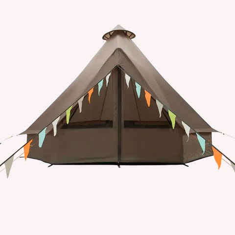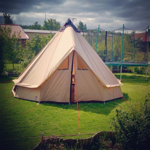 Tält i tipimodell i beige färg. Rymlig konstruktion med mittstång och flera stormlinor runt om för stabilitet.