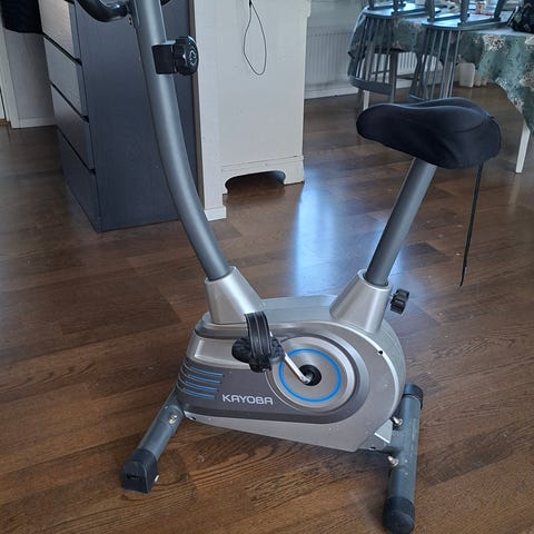 Motionscykel med inbyggd träningsdator och display som visar grundläggande träningsdata. Utrustad med justerbart säte och styre samt pedaler med remmar för bättre fotfäste. Lämplig för inomhusträning och konditionsträning i hemmet.skickas inte.