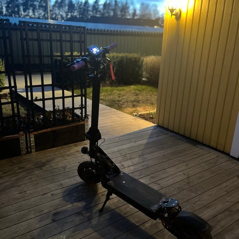 Elsparkcykel i svart färg. Modellen har ståplatta, styre med handtag och ringklocka som är trasig samt fram- och bakhjul anpassade för stadskörning. Passar för kortare transporter och pendling på hårda underlag som asfalt och gångvägar. Laddningsbar eldrift, detaljerad teknisk specifikation beror på exakt modell och årsmodell. Stänkskyddet där bak låter lite och fram hjulet rullar inte kostar kanske 300-700 att fixaelscootern går i 22km/h