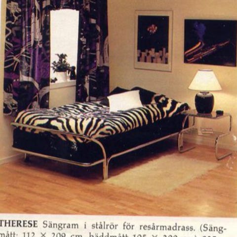IKEA säng och sängbord i vit färg. Sängen har huvudgavel och är placerad på ben med fri yta under. Bredvid sängen finns ett matchande sängbord med en låda och ett skåp med dörr. Passar i sovrum eller barnrum där en enkel och enhetlig möbelgrupp önskas.