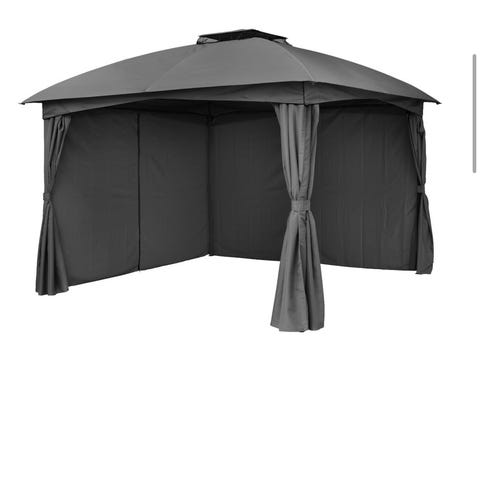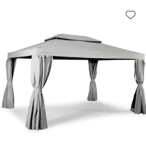 Nordmarka paviljong i storlek cirka 3 x 4 meter i grå färg. Paviljongen har tak och sidogardiner som kan dras för eller knytas upp vid behov. Lämplig för användning i trädgård eller på större uteplats som skydd mot sol och lättare regn, samt för utemöbler som matgrupp eller loungemöbler.