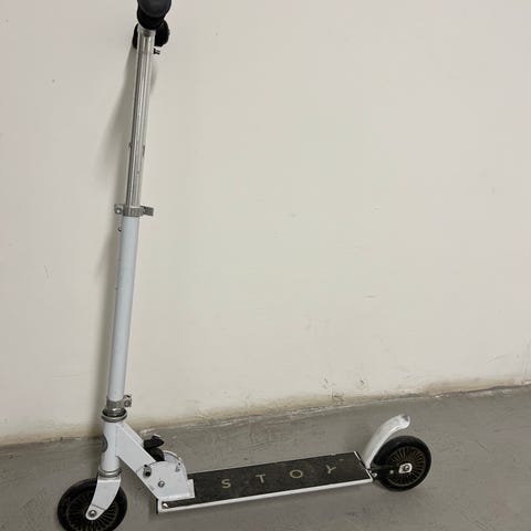 Sparkcykel med stora orange hjul och justerbart styre. Ram i metall med ståplatta och handtag med svart och vitt grepp. Lämplig för barn eller ungdomar för användning på plana underlag som asfalt eller betonggolv.