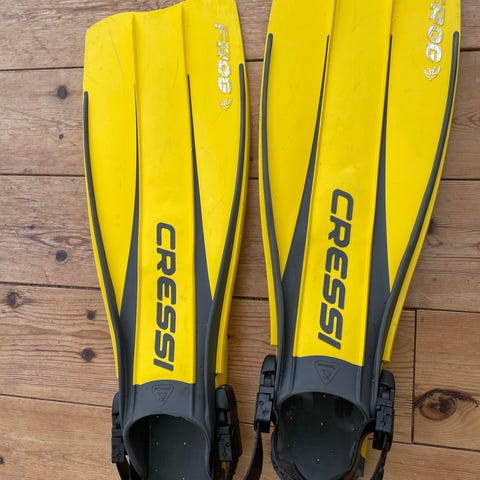 Cressi Sub Frog simfenor i gul färg. Öppen häl med justerbara hälremmar. Lämpliga för snorkling och dykning. Storleksmärkning syns på undersidan av fenorna (se bild för detaljer). Äldre modell som passar för nybörjare eller mindre aktiv dykare.