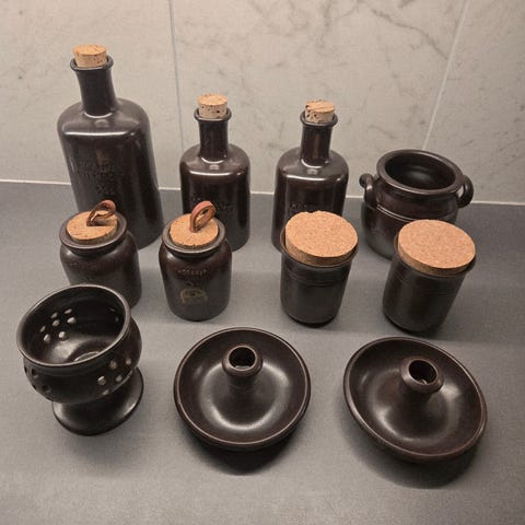 Keramiska karaffer och vaser i svart glasyr med gröna handtag. Setet består av flera delar i olika storlekar med liknande formgivning.