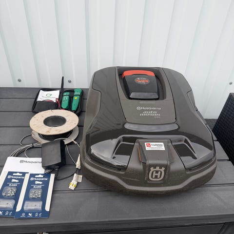 I fint skick med terränghjul (lite större dubbar), den har nyckelpige-dekaler. Installationskit med ett bra antal märlor och ca. 110 meter begränsningkabel samt klämkontakter för anslutning till laddstation och för eventuell framtida skarvning. Laddstation och nätdel är förstås med.