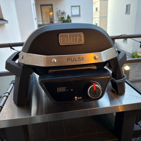 Weber Pulse elgrill med stativ i svart utförande. Elgrillen har två reglage på frontpanelen för temperaturstyrning och digital display. Grillgallret är i gjutjärn och locket är gångjärnsfäst. Under grillen finns hylla för förvaring och stativet har hjul baktill för enklare förflyttning. Till grillen hör strömkabel och skydd/överdrag som syns på bilderna. Passar för användning på altan, balkong eller uteplats där eluttag finns. Använd endas 3 gånger. Mycket fint skick. El-paketet har förvarats inomhus. Nypris 10000:-.