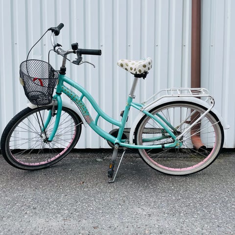 Utrustad med korg fram och pakethållare bak.