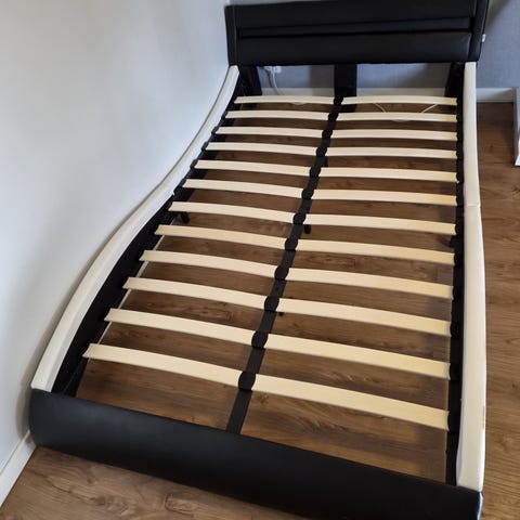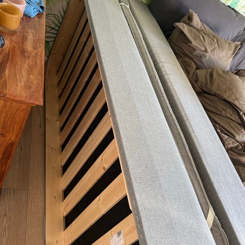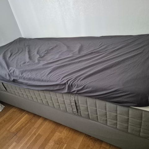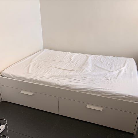 Säljer denna sängram + madrass från IKEA pga flytt, storlek 120cm. Två lådor under sängen för bra förvaring. Den är några år gammal men i bra skick, lite små skav och märken som syns på bilderna. Jag flyttar lördag 25/4, går att hämta tidigast då.
