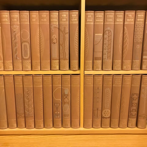 Priskurantens lexikon böcker med gul hård pärm. Flera volymer i samma serie, med numrerade band. Inbundna böcker som kan användas som uppslagsverk eller referenslitteratur. Antal band framgår av bilderna. Alla 25 böcker