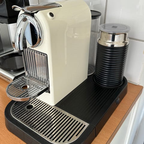 Nespresso kapselmaskin med mjölkskummsre och vattentank på baksidan. Sparsamt använd. Hör gärna av er om ni har några frågor!