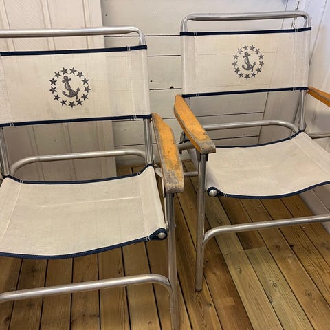 Två hopfällbara däckstolar i mycket gott skick. Armstöd i trä. Priset avser båda stolarna.