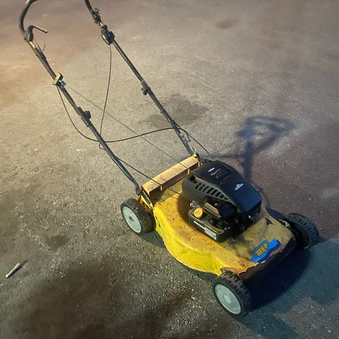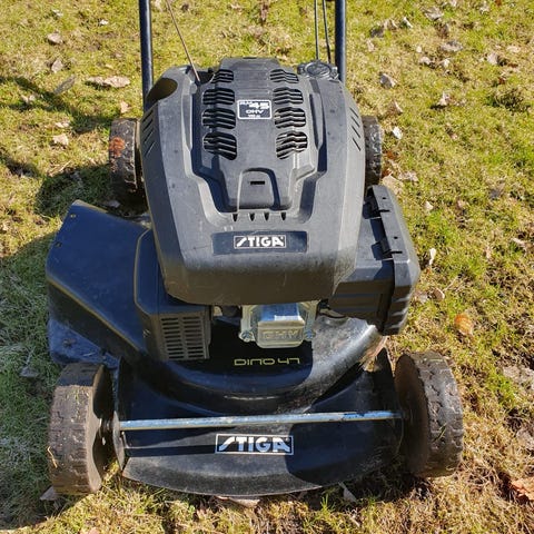 Nyservad stiga 45 med ny olja och rengjord förgasare. Startar direkt. Höjdjusteringen på ena framhjulet går bara att justera med verktyg då den har gått sönder. Knivarna nyslipade också. Perfekt inför sommaren