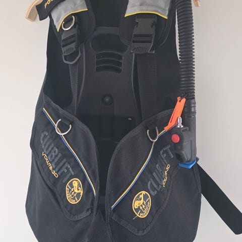 Smidig BCD där det går att ta bort viktfickorna och istället använda medföljande remställ/sele för resa (travel harness).