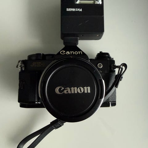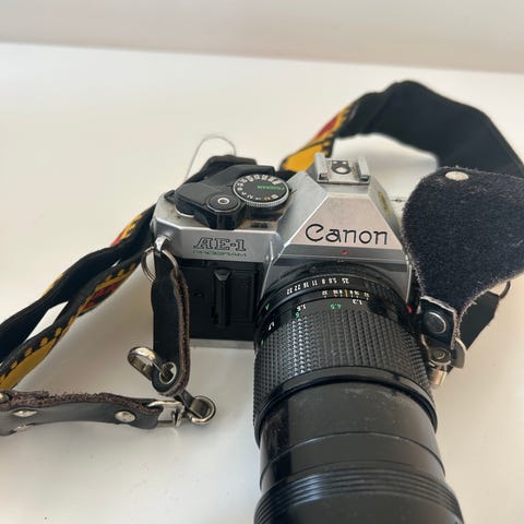 Begagnad analog systemkamera i fint skick (2). Kameran levereras med objektiv och rem samt Speedlite 155A blixt.