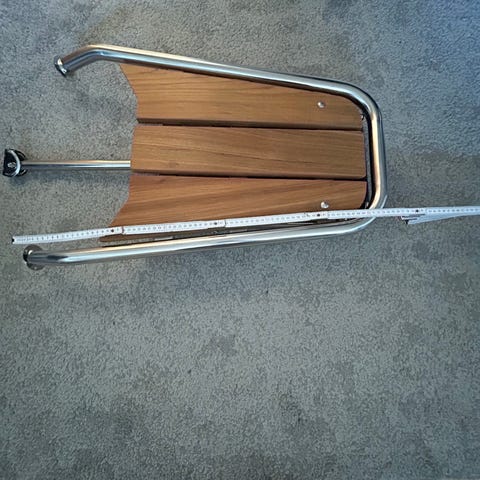 Badplattform med integrerad stege för båt. Konstruktion i rostfritt stål med trall i trä eller komposit. Stegen är fast monterad på plattformens ram och har flera steg för enklare ombordstigning från vattnet. Plattformen monteras i aktern på båten och ger en plan yta för bad och uppstigning. Passar fritidsbåt där extra badplattform önskas eller där befintlig plattform behöver bytas ut.