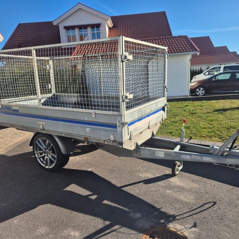 Sävsjö släpvagn med gallergrindar, och möjlighet att tippa flaket.