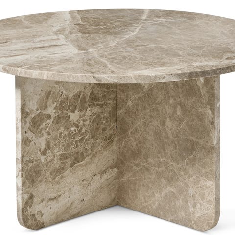 Soffbord med kvadratisk bordsskiva i brun marmor med ljusare ådring. Underrede i mörkt trä eller träliknande material med kryssformad fot som ger stabilitet. Bordet fungerar som soffbord i vardagsrum och har en låg höjd anpassad för placering framför soffa eller fåtöljer. Marmorskivan ger en hård och tålig yta som lämpar sig för böcker, dekorationer och servering.
