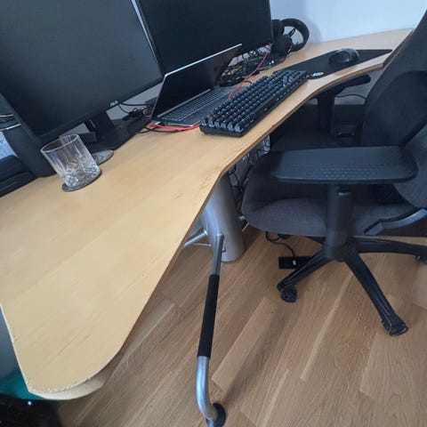 Elektriskt höj- och sänkbart hörnskrivbord.