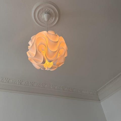 Le Klint stjärnformad lampskärm i vit färg. Lampskärmen har ett veckat, geometriskt mönster som bildar en stjärna. Den är avsedd att hängas i tak eller fönster och ansluts med sladd och stickkontakt, som syns på bilderna. Passar som dekorativ belysning vid olika högtider och som stämningsbelysning i hemmet. Materialet är ett fast, vikbart skärm-material typiskt för Le Klint, i ljus, neutral ton som sprider ett mjukt ljus när den är tänd.