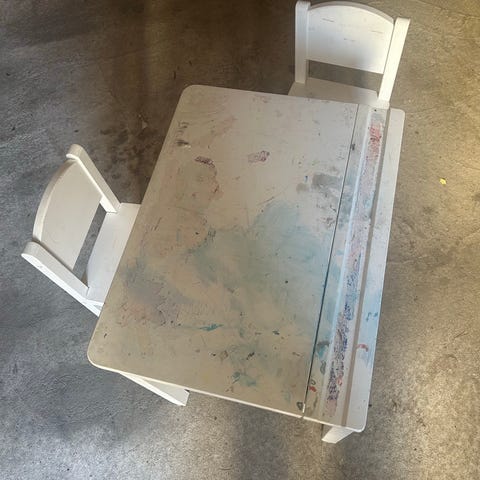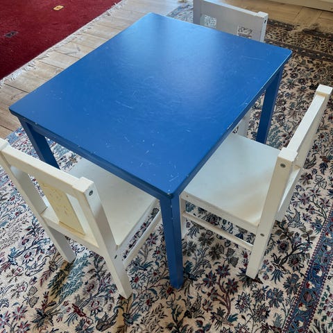IKEA barnbord och stolar i vit färg. Setet består av ett rektangulärt bord och två stolar i barnstorlek. Möbeln är anpassad för barn och passar för exempelvis lek, pyssel eller måltider. Utförande i träbaserat material med täckande vit yta. Enkel, rak design med stabila ben och raka sitsar/ryggstöd på stolarna. En flisa som är borta från ena stolen och hack i bordet i övrigt mycket fina. Se bilderna.
