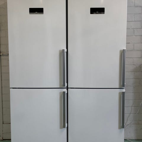 Kyl frys i vit färg med överdel som kyl och underdel som frys. Två separata dörrar med integrerade handtag på sidan. Passar för förvaring av mat och frysvaror i kök eller grovkök.