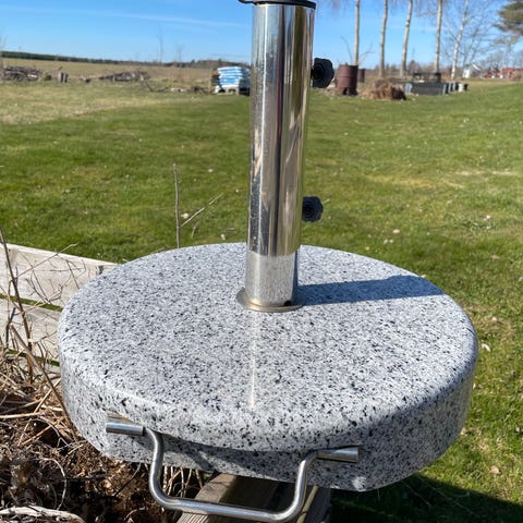 Parasolllfot i betong. Rund fot med rörfäste i metall för parasollstång. Lämplig för användning utomhus på uteplats, altan eller trädgård för att ge stabilitet åt parasoll.