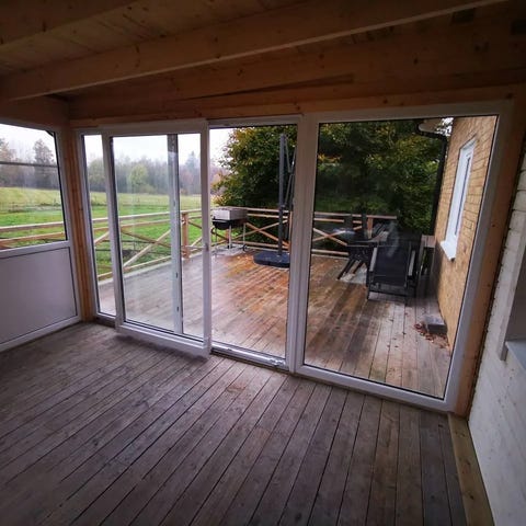 Inglasning 8m inkluderar: skjutparti 400cm/210cm och 2x fast sidofönster 200cm/210cm