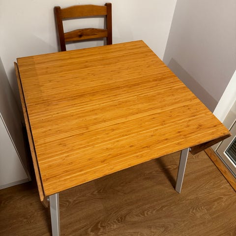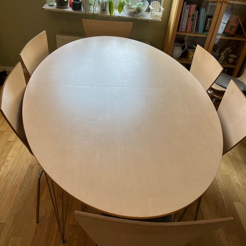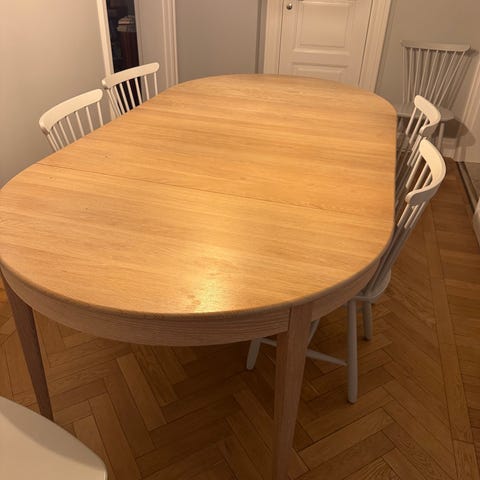 Säljer mitt matbord, utdragbart med möjlighet till 2st iläggsskivor med totallängd på 235cm. Utan iläggskivor är längden 123cm. Bordet är från IKEA Strandtorp. 4st stolar ingår, även de från IKEA, Rönninge.