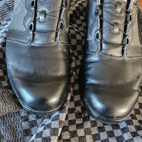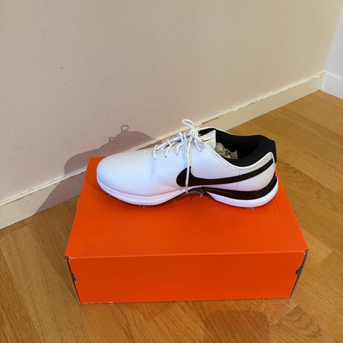 Nike golfskor i storlek 42. Svarta skor med klassisk snörning och brogue-detaljer på ovandelen. Utrustade med utbytbara dubbar under sulan för grepp på golfbanan. Passar för golfspel på gräsunderlag.