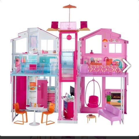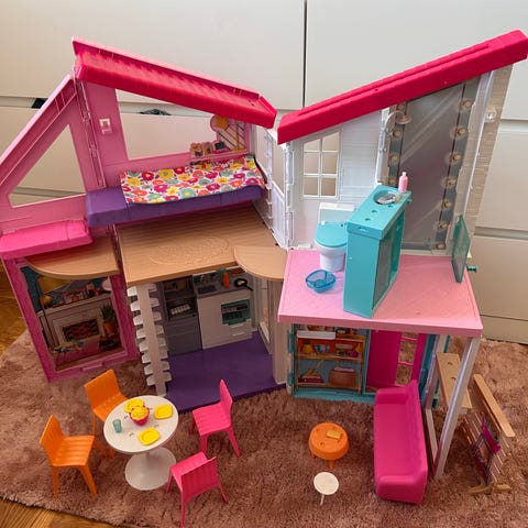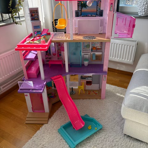Barbie dockhus med flera våningar och öppningsbar framsida. Huset är huvudsakligen rosa och vitt med detaljer i bland annat turkos och lila. Inredning och tillbehör som soffa, stolar, bord, säng, toalett och köksdel ingår enligt bilderna. Dockhuset är hopfällbart för enklare förvaring och lek kan ske både inne i huset och på de olika våningsplanen. Passar för lek med Barbie-dockor och liknande dockor i liknande storlek.