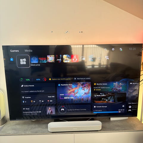 Samsung tv med platt skärm. Tv:n står på en bordsfot och har en medföljande Samsung-fjärrkontroll enligt bilderna.