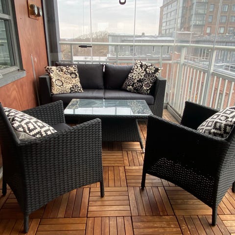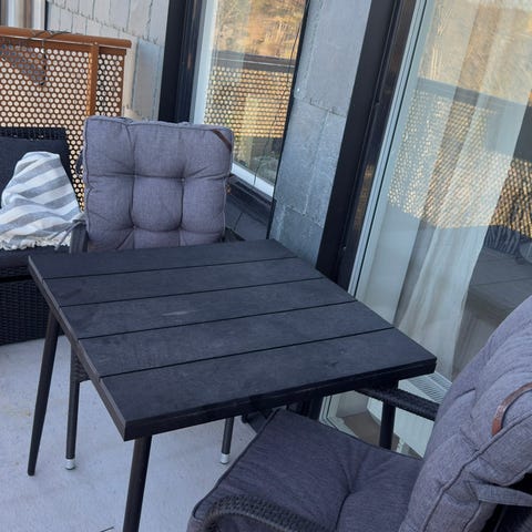 Cafégrupp med balkongmöbler i brun konstrotting. Setet består av flera stolar med rundad rygg samt ett lågt bord eller pall med plan ovansida. Möblerna är anpassade för utomhusbruk, exempelvis på balkong eller mindre uteplats. Konstrotting är ett syntetiskt material som är gjort för att tåla väderpåverkan bättre än naturrotting och är enkelt att rengöra med milda rengöringsmedel och vatten.