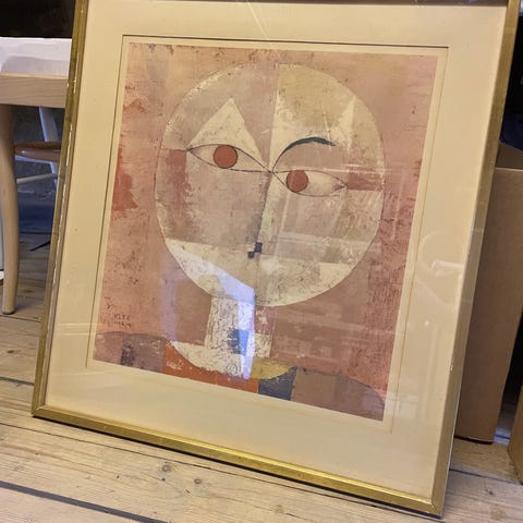 Litografi av Esaias Thorén 1950-tal med träram i flerfärgad design. Motiven föreställer stiliserade ansikten respektive dekorativa former och figurer i dova färger. Båda verken är inramade bakom glas med ljus passepartout och tunn träram. Passar exempelvis i vardagsrum, hall eller kontor som väggdekoration.