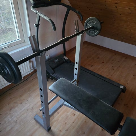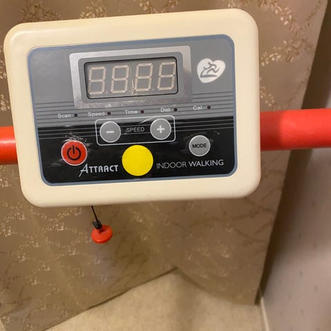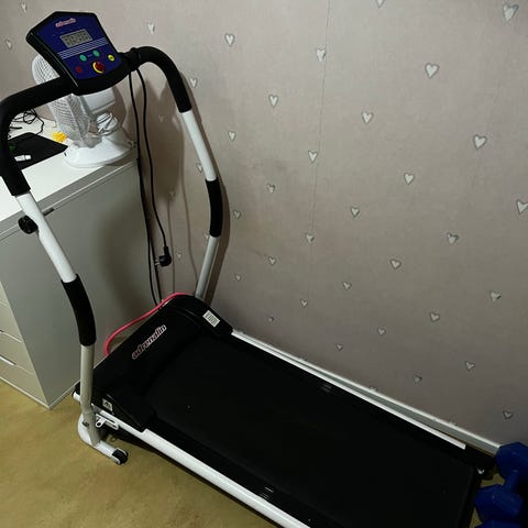 Löpband i lila färg med vit ram. Utrustat med handtag och säkerhetslina. Passar för gång och lättare löpträning inomhus. Löpbandet är kompakt och lämpar sig för hemmabruk där utrymmet är begränsat.