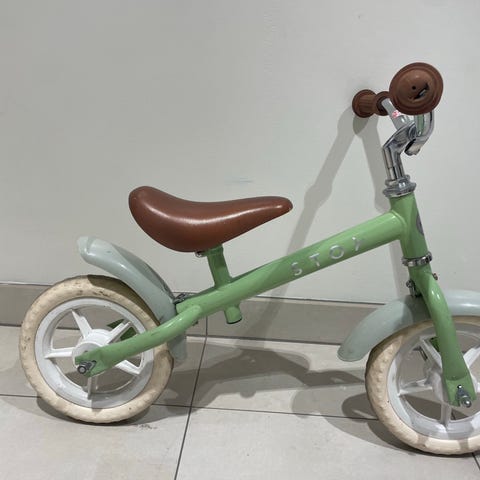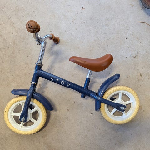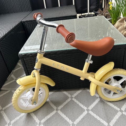 Balanscykel från STOY. Cykeln har en svart ram, bruna handtag och sadel samt vita hjul med beigefärgade däck. Denna balanscykel är designad för att hjälpa barn att utveckla sin balans och koordination.