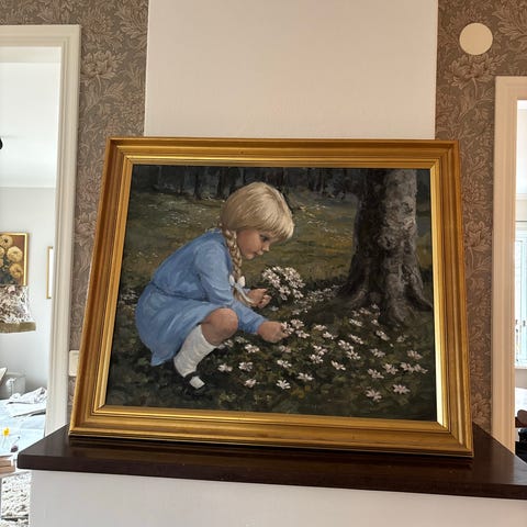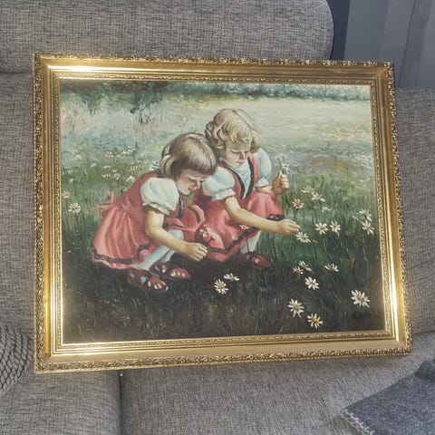 Gulligt motiv och en rejäl ram som mäter 94 * 73 cm. Kan inte läsa vem konstnären är. För avhämtning I Piteå centralt