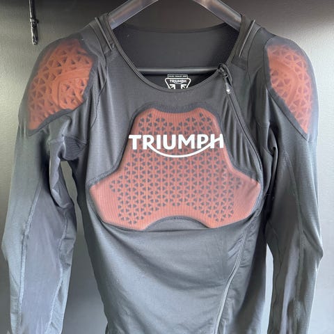 Den är tillverkad i perforerat läder vilket gör den sval och bekväm vid varmare körning. Stretchpaneler ger en smidig och sportig passform med bra rörelsefrihet. Jackan är utrustad med D3O-skydd i axlar, armbågar och rygg, och är även förberedd för bröstskydd för den som vill komplettera. Den har en stilren och sportig design med tydlig Triumph-logga och kan kopplas ihop med byxor via dragkedja.