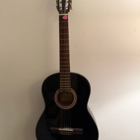 Cataluña akustisk gitarr i svart utförande. Klassisk kropp med nylonsträngar och rund ljudhålskant med dekorativ rosett. Gitarren har bandad greppbräda och mekanik för sex strängar. Levereras med axelband enligt bild. Passar för akustiskt spel i hemmet, övning och enklare framträdanden.
